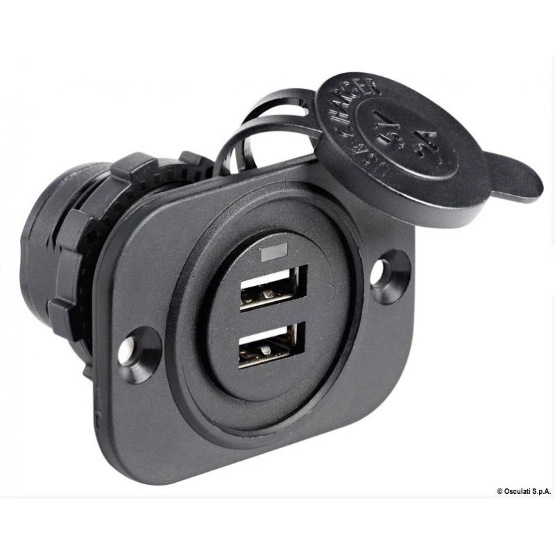 Doppelte USB-Buchse aus Nylon mit wasserdichter Schutzkappe mit 12/24 V Eingang und 5V – 3,4A USB Ausgang. Ideal zum Aufladen Ihres Smartphones, Tablets … Sehr einfach an Bord Ihres halbstarren, offenen Rumpfes, Segelboote, Motorbootes … Schnelle Montage mit hinterer Mutter.