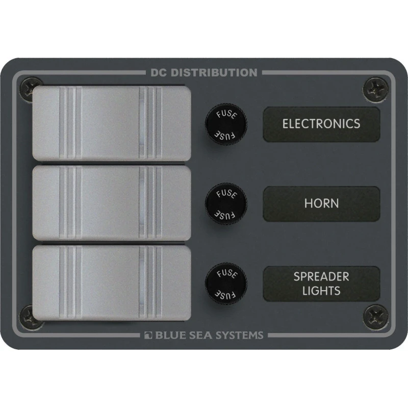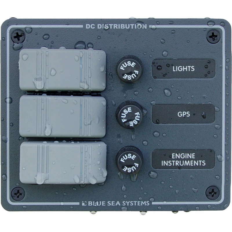 Diese elektrische Schalttafel mit 3 Schaltern von Blue Sea Systems ist wasserdicht gemäß IP66.