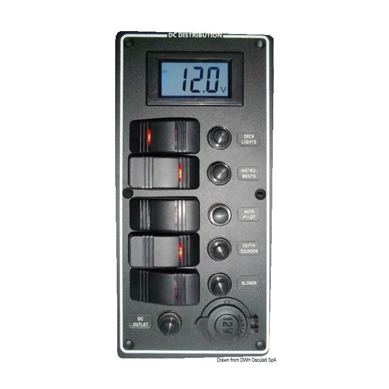 Schalttafel aus Aluminium, mit schwarzem Epoxidharz beschichtet, ausgestattet mit 5 Kippschaltern mit integrierten Kontroll-LEDs, einer Zigarettenanzünderbuchse und einem digitalen Voltmeter. IP66-zertifiziert.