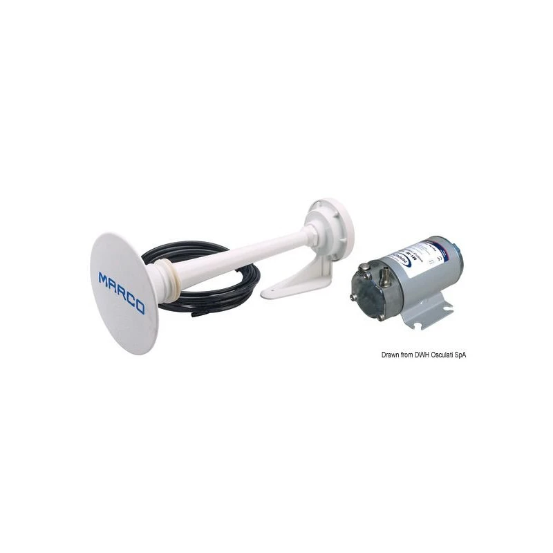 RINA geprüft für den Segelsport über 12 Meter Länge hinaus und Berufsschiffe (Fischerboote und andere) von 12 bis 20 Meter. Horn aus Weiß-lackiertem Messing. Mit Kompressor und Montage-Kit.