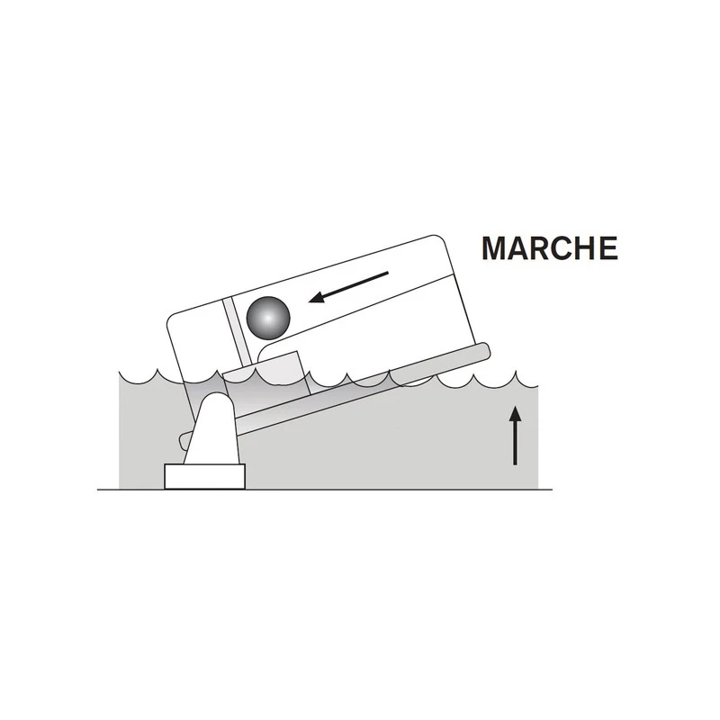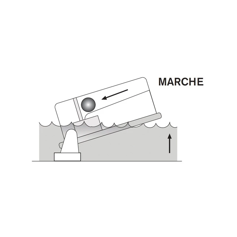 Funktionsweise: Wenn der Wasserpegel steigt, wird der Schwimmer angehoben und bringt eine kleine Stahlkugel zum Kippen, die dann einen elektrischen Kontakt schließt, so dass die Bilgenpumpe ausgelöst wird