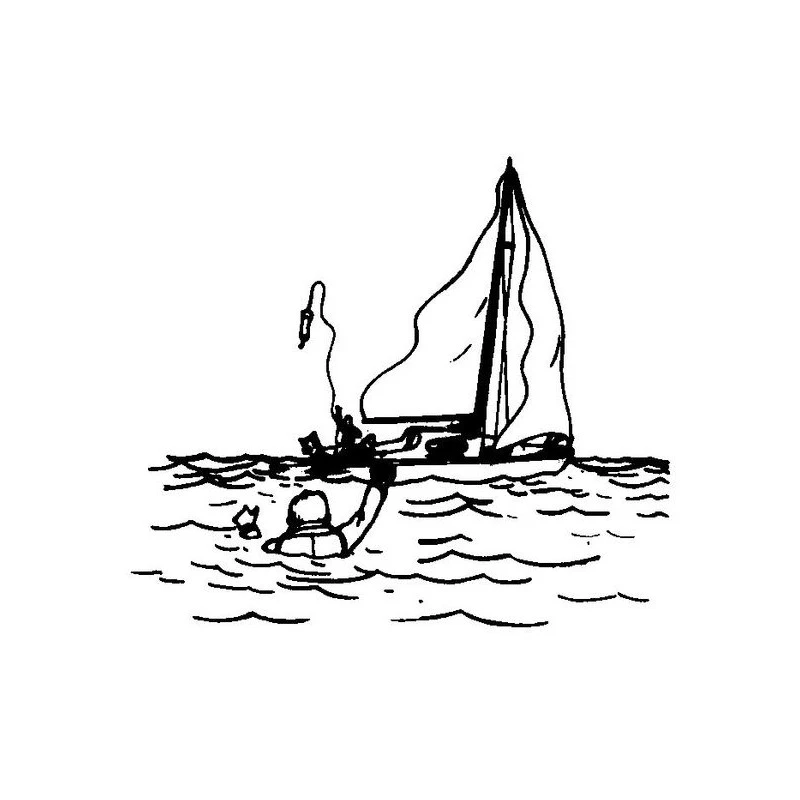 Bei einem Notfall entfernt man den Lifelink von dem Behältnis, befestigt die Leine mit einem Knoten am Boot und wirft den Rettungsring ins Wasser zu der schiffbrüchigen Person.