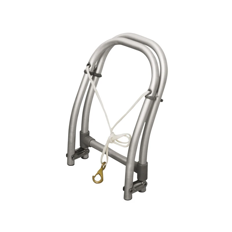 Zusammenklappbare Leiter, dadurch Platzgewinn an Bord, wenn sie nicht angebracht ist.