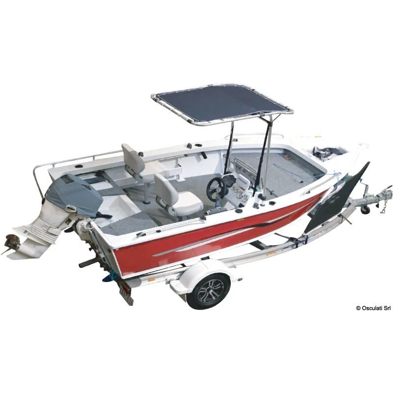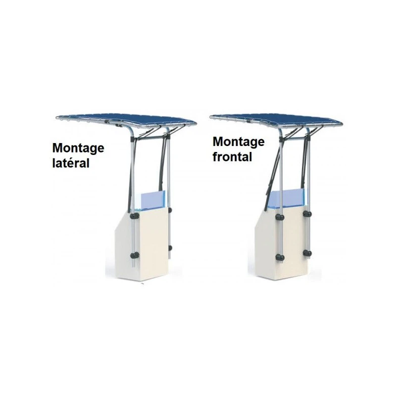 Aluminium T-TOP, ideal zum Schutz vor der Sonne während Ihrer Bootsfahrten. Dieses robuste T-Top ist mit einem Aluminiumrohr mit 32 mm Durchmesser ausgestattet. Es wird direkt an der Konsole entweder seitlich an jeder Seite der Konsole oder frontal an der Vorderseite der Konsole installiert (siehe Foto). Es passt auf die meisten Konsolen, auch auf die kleinsten. Die Sonnenblende aus Polyester kann eingefahren oder entfernt werden.
