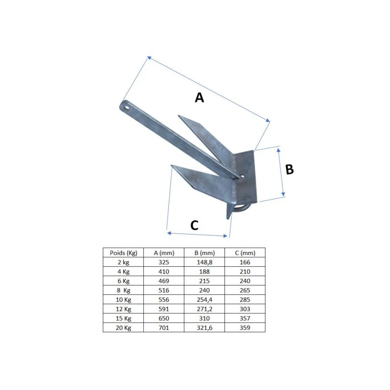 Dieser Plattenanker ist in verschiedenen Gewichtsklassen erhältlich, entsprechend der Größe und der Nutzung Ihres Bootes: 2, 4, 6, 8, 10, 12, 15 und 20 kg.
