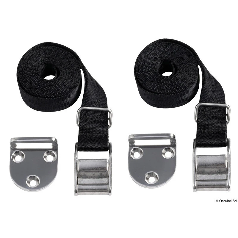 Befestigung am Boden mit 2 Edelstahlplatten (mitgeliefert) und verstellbarem Riemen mit selbstverriegelnder Edelstahlschnalle.