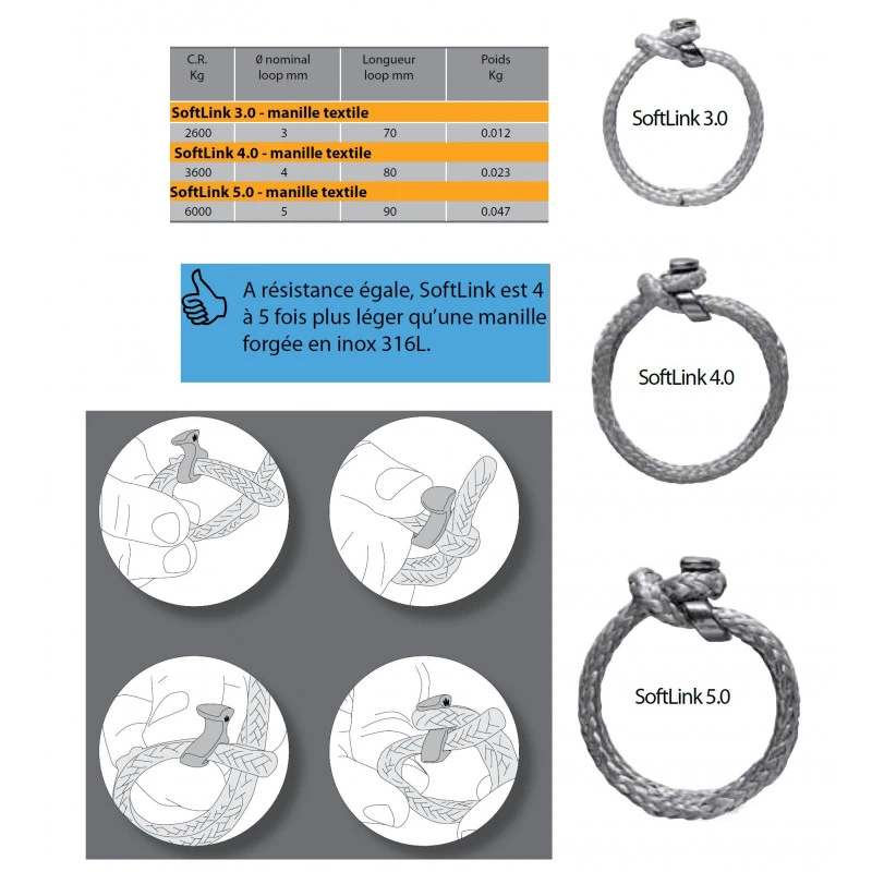 - Bei gleichem Widerstand ist SoftLink 4 bis 5 Mal leichter als ein geschmiedeter Stahlschäkel 316L.